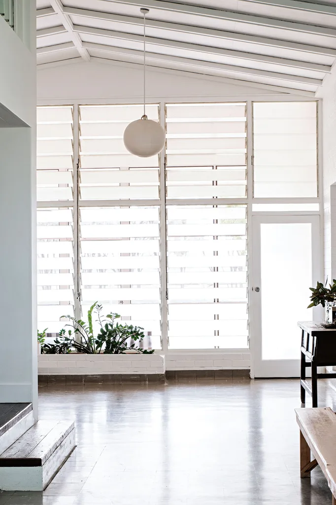Open living spaces under the raked ceiling are flooded with light filtering the home’s glass louvred windows.
