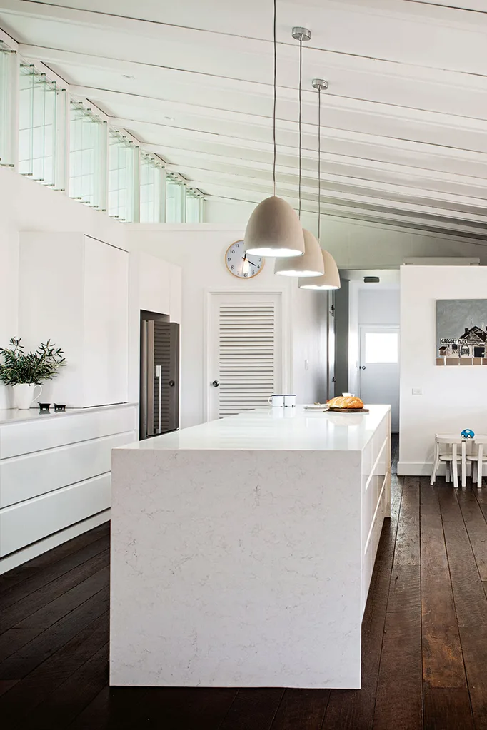 The three concrete kitchen pendants that hang above the island bench weigh eight kilograms each and came from a NSW business Jayde discovered online, Viore Design.