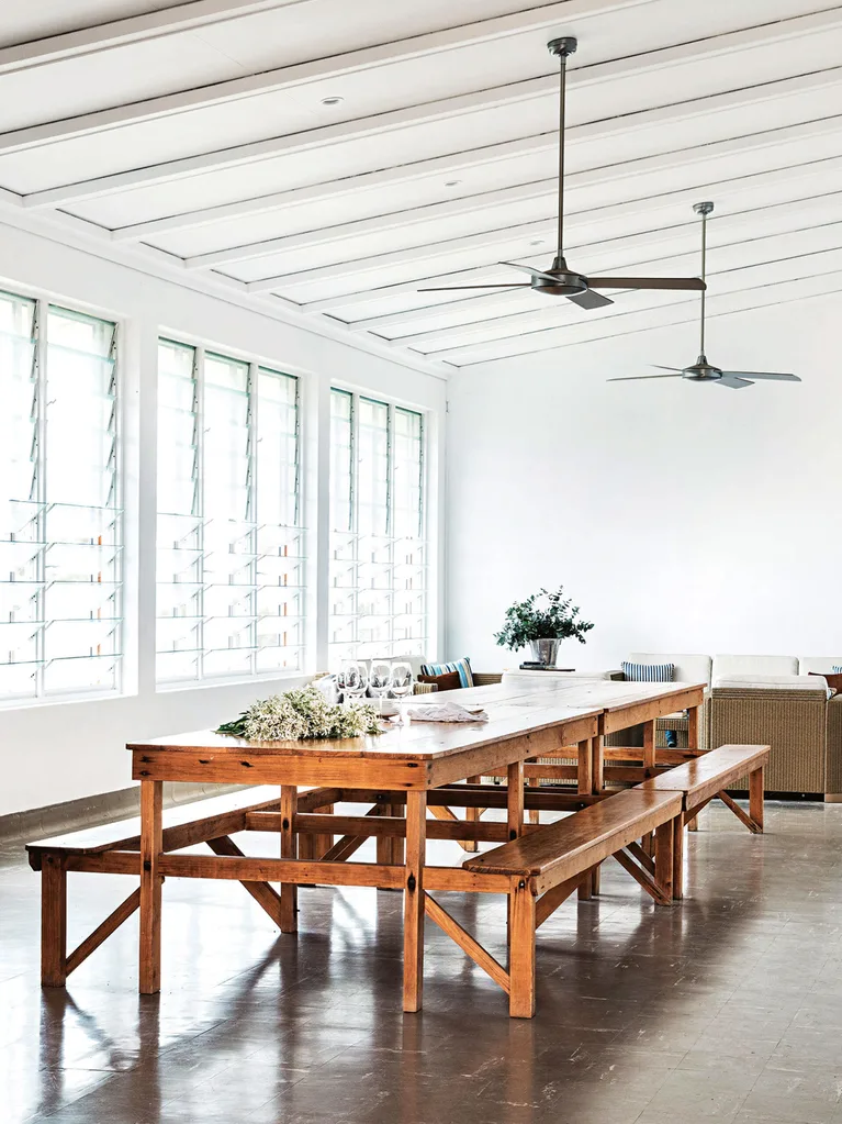Two tables found in the old shearing shed were restored by Ben to form a grand dining suite.