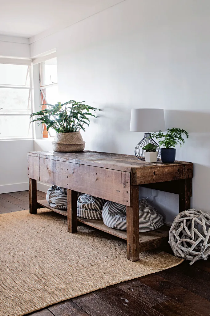 An old workbench holds the boys’ beanbag chairs to keep the living room floor clear.