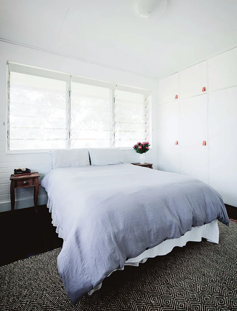 In the guest bedroom, original built-ins were painted and new tab handles were made by Jayde from a saddler’s leather offcuts.