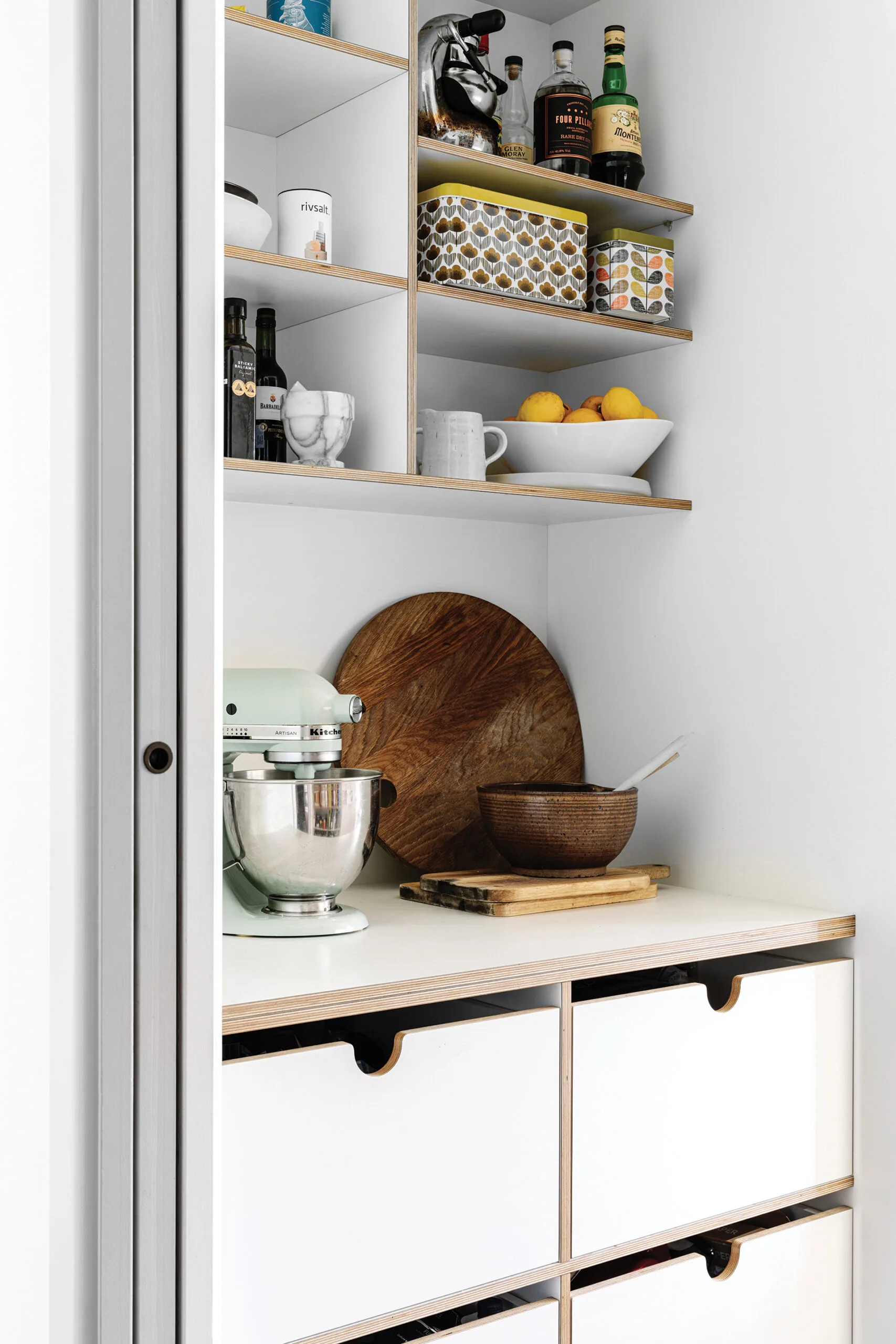 PANTRY The cabinetry is Laminex White on white birch plywood with an exposed edge. Half-moon handle cut-outs were created for the drawers. These are complemented by fluting in the pantry sink and plaster wall lights. Using existing shapes and elements help to honour the house’s past, while being part of what should be a more sustainable, low-impact future.