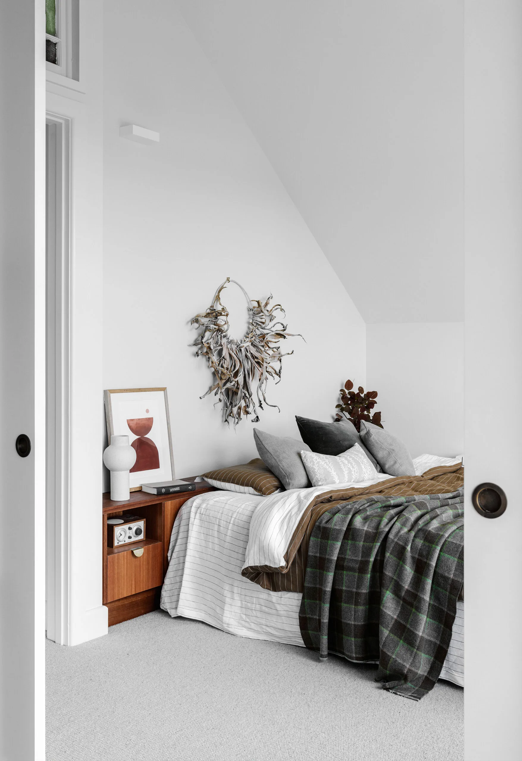 MAIN BEDROOM The hybrid bedhead-side-tables design by Brave New Eco was built by Pledge Custom Builders. Bedding, In The Sac. Fan, Fanco. Levante wool carpet in Felucca, Bremworth. Wall paint, Dulux Vintage Linen. Agave leaves decorative piece by Kate Jerrems. Painting by Bobby Clark.