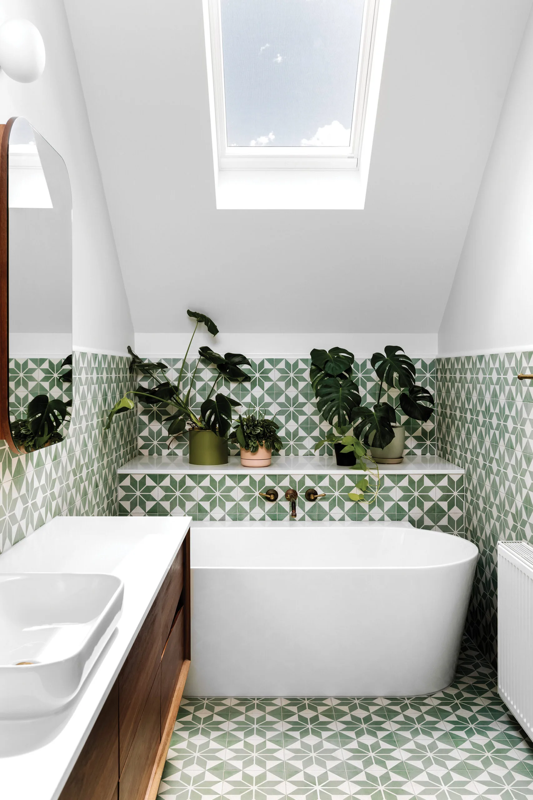 ENSUITE A Velux skylight supplies this green-hued bathroom with plenty of natural light. Above the spotted-gum vanity by Ingrain hangs a custom mirror by Brave New Eco. Tiles, Jatana Interiors. Bath, Clark. Basin, Caroma. Tapware, Consolidated Brass Tapware. Wall light, Vistosi.