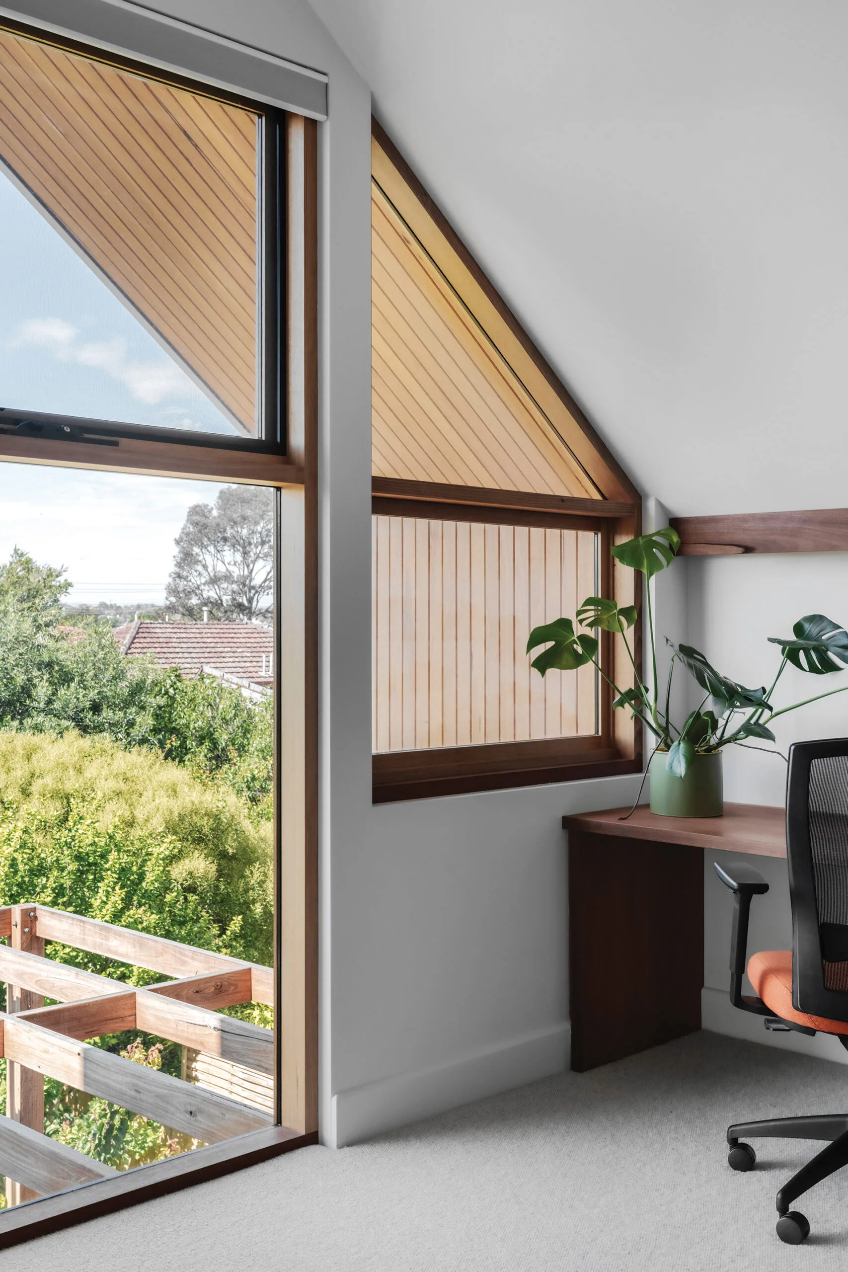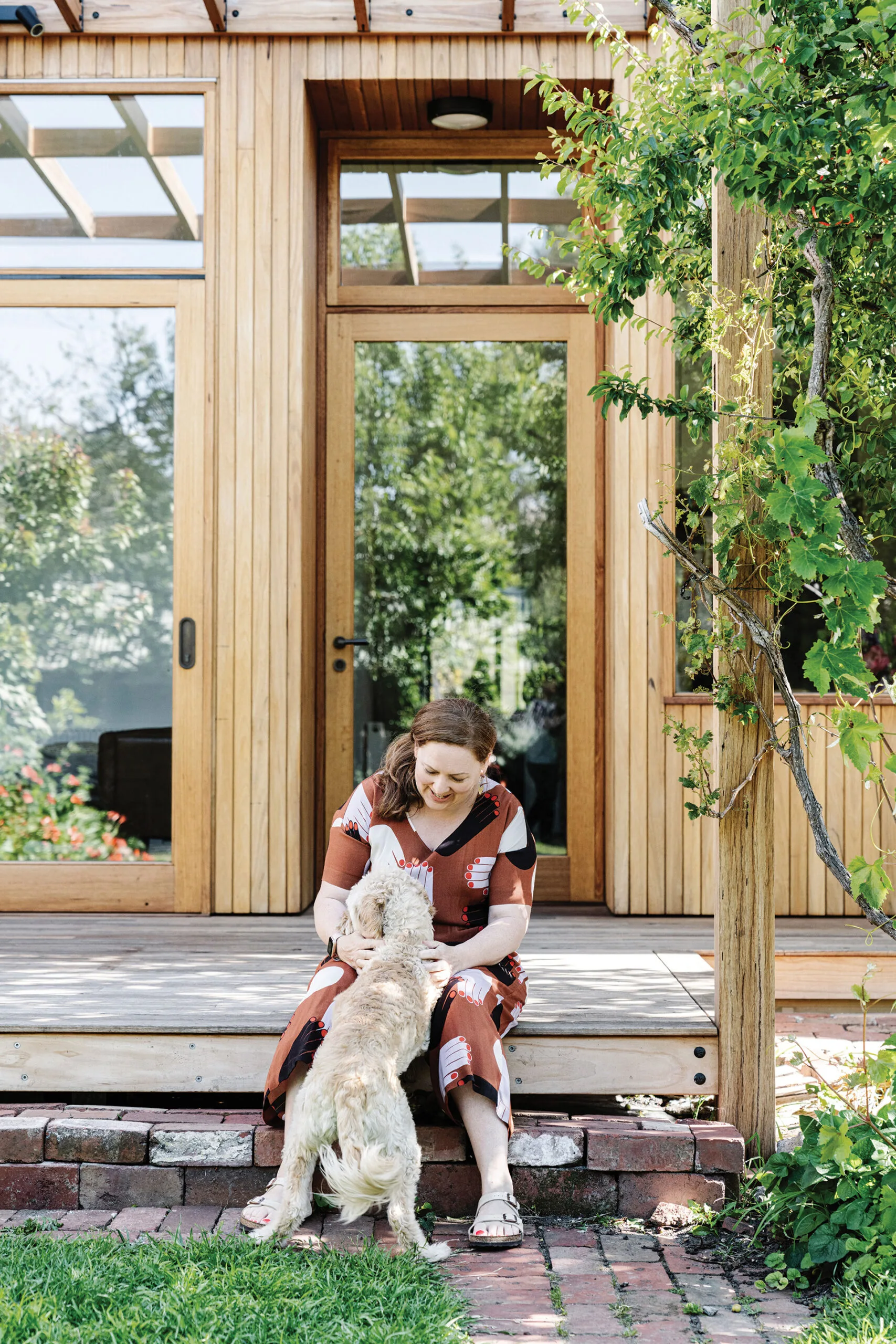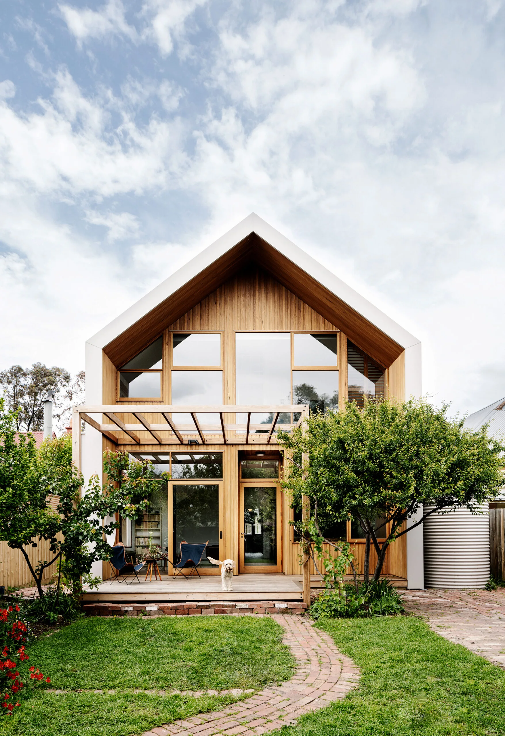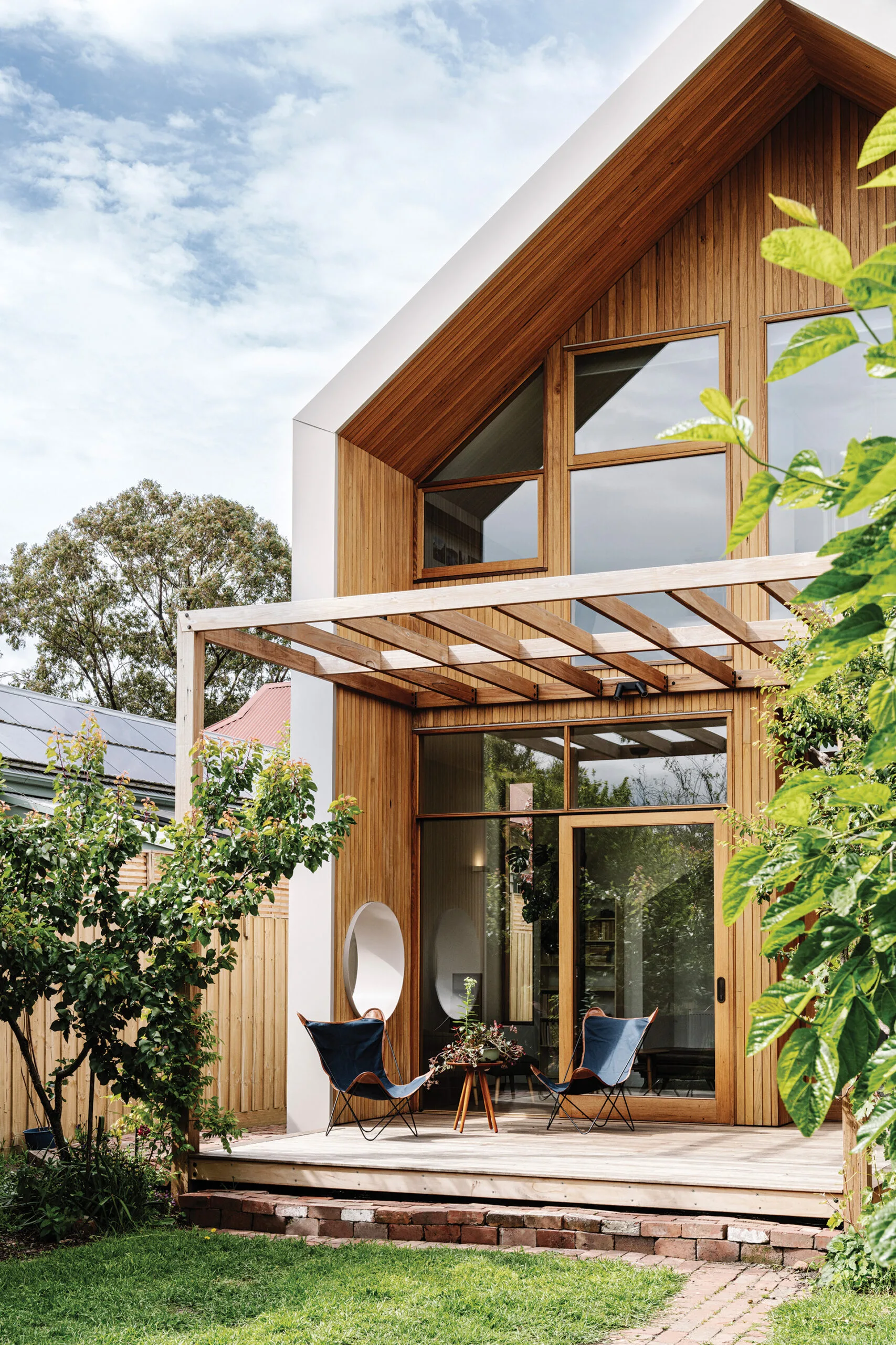 EXTERIOR Spotted-gum lining boards wrap around the underside of the north-facing gabled eave at the back of the house; silvertop ash was used for the decking. Pavers, upcycled brick. White window frame, Pledge Custom Builders. Furniture, Gumtree.