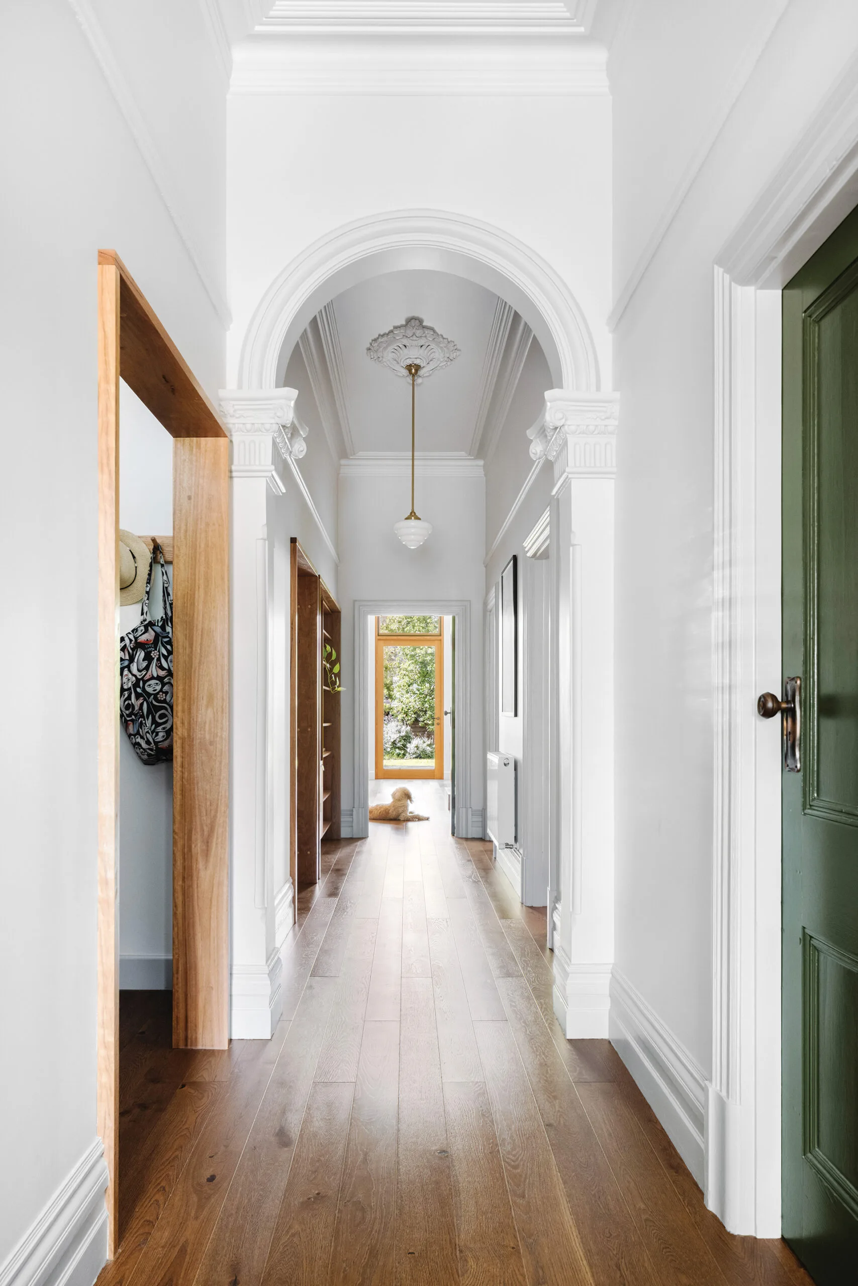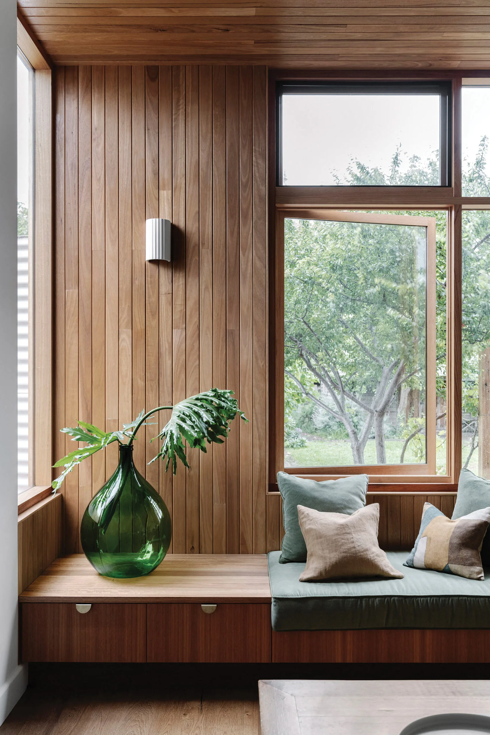 “Sarah and her husband had a favourite coloured-glass window in the original bathroom that we were able to repurpose into a highlight window above their bedroom door upstairs,” explains Megan. “The plum and green glass of this and the front bay window were used as design cues. To this, we added a plum-colour on the front door, a rich deep green on all the original internal doors, deep plum pendant lights that overhang the kitchen island and a plush green-velvet seat cushion that is the standout for the dining area’s window seat.”