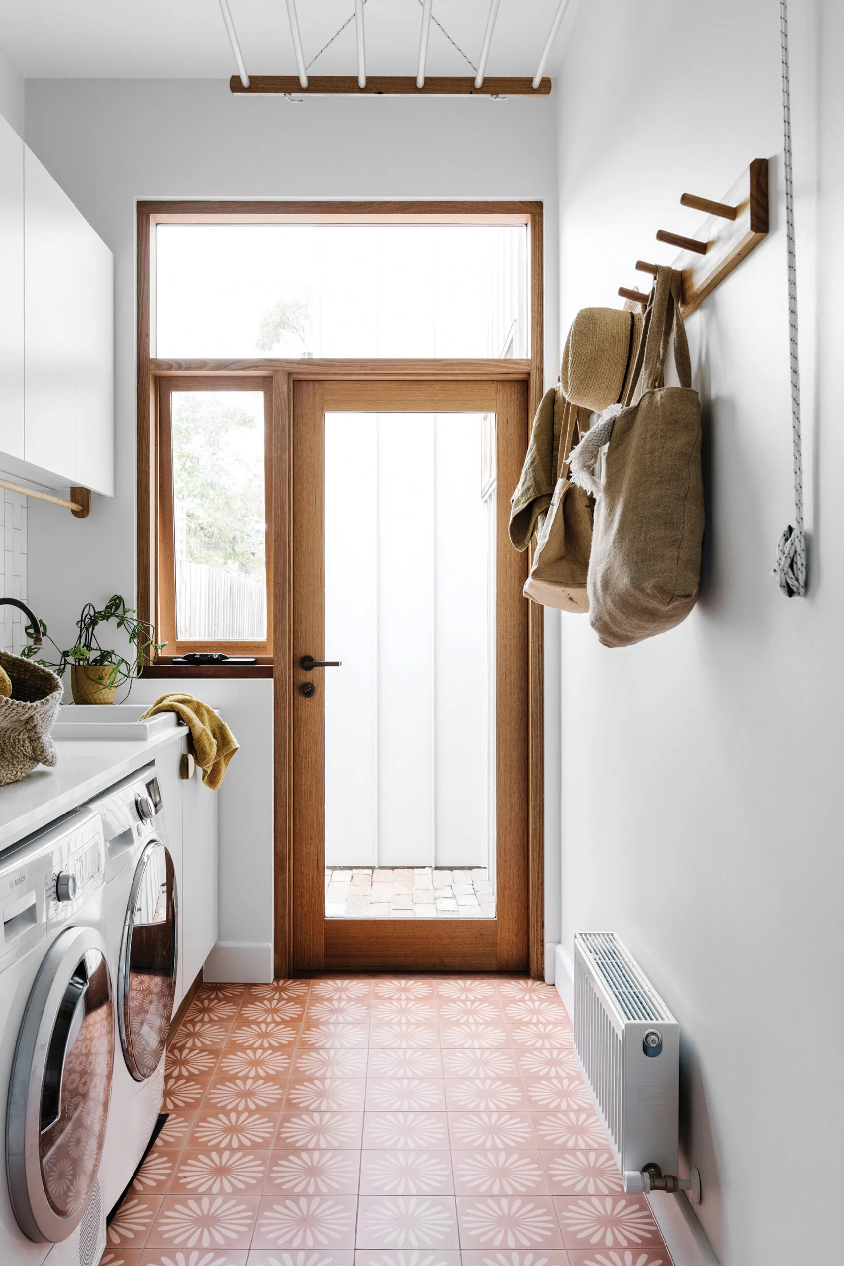 LAUNDRY Daisy-patterned tiles from Jatana Interiors line the floor, paired with a simple splashback in tiles from Academy. The cabinetry is finished in two Laminex colours: Oyster Grey and White. Sink, Seima. Tapware, Auhaus. Rail, Brave New Eco. Hooks, Usethings.