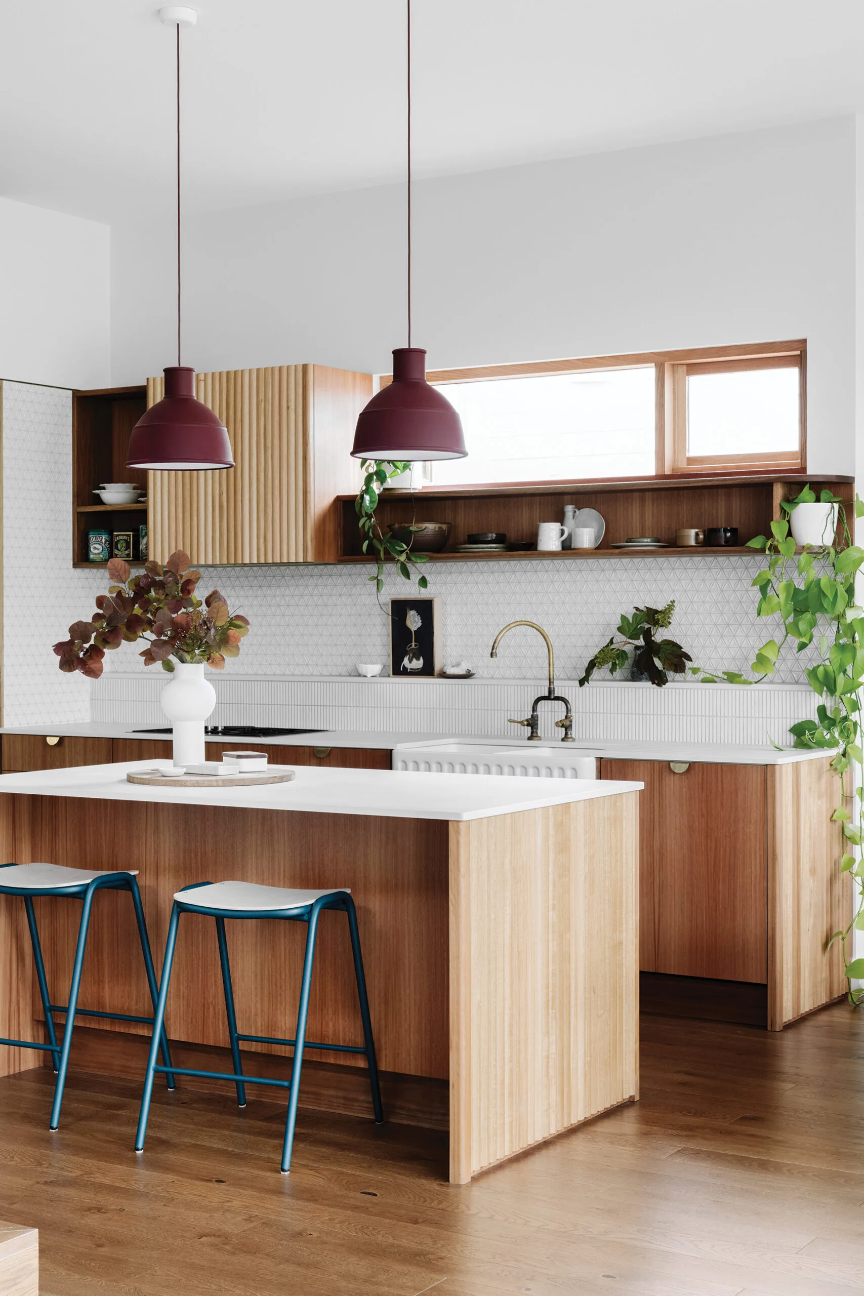 KITCHEN “The splashback’s pattern-relief tile from Academy Tiles references the pressed-metal cladding at the front of the house,” says interior designer Megan Norgate. Sink, Butler Sinks. Taps, Consolidated Brass Tapware. Cabinetry, Eco-cert spotted-gum timber veneer and Porta Riverine lining boards. Handles, Auhaus. Bar stools, Koskela. Unfold pendant, Muuto.