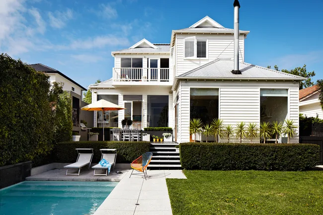 Versatility was top of mind when Janita and Rob were planning the renovation of this home. “We wanted Maddie and Charlie to hang out here, with as many friends as they liked,” says Janita. The verdant garden, azure pool and white weatherboard facade create a fresh, summery feel yearround.