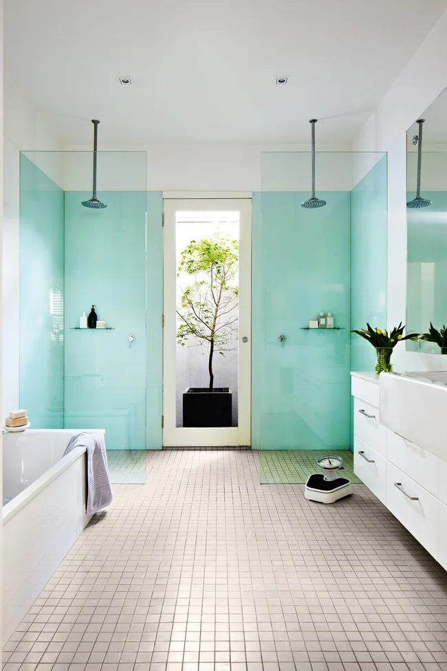 His and hers walk-in showers are separated by a glass door that leads to a walled side passage – a neat solution for letting steam out of the bathroom.