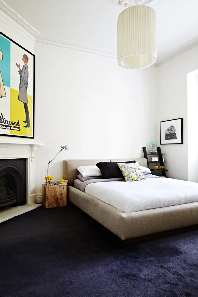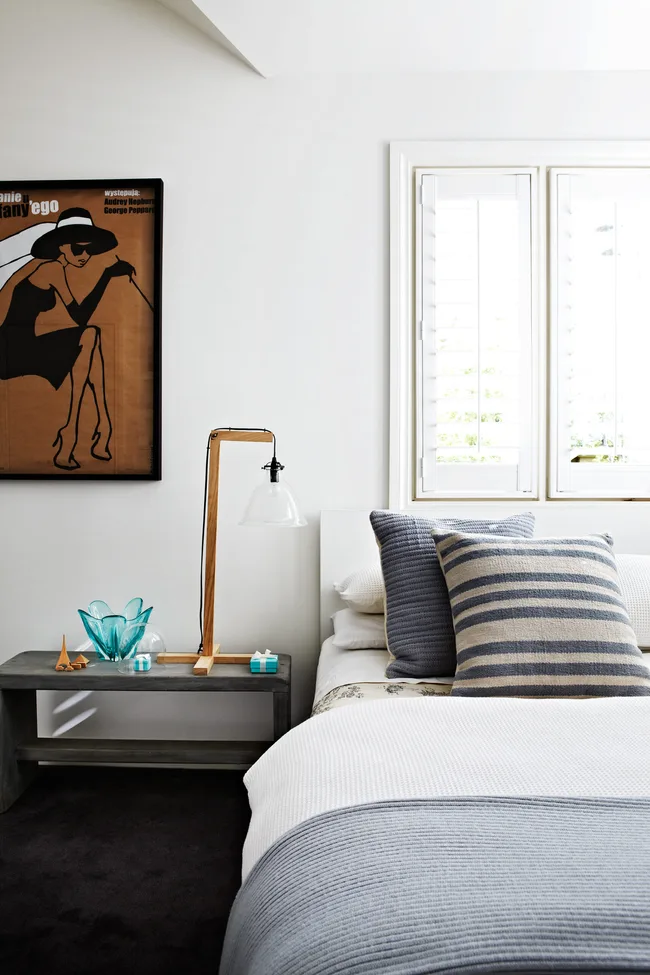 Janita’s fondness for mixing eras is evident in the main bedroom. A vintage poster hangs over the fireplace; the Tolomeo lamp from Artemide is a design classic and the raw timber side table by Mark Tuckey is a rustic touch.