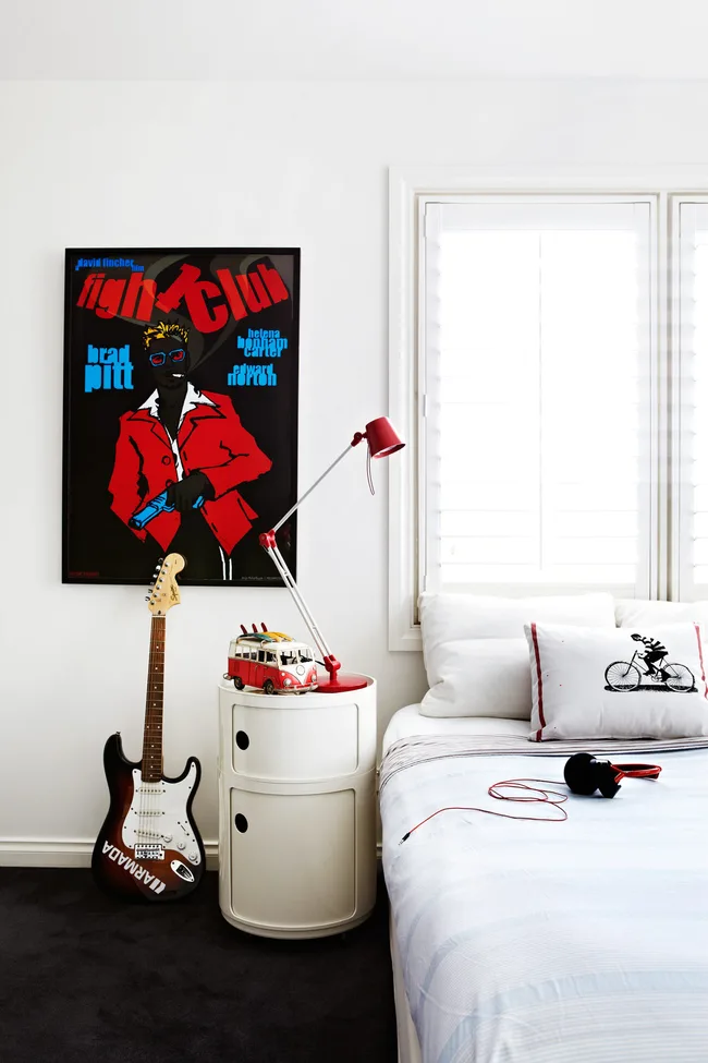 In Charlie’s room, a cushion made from a tea towel is a cost-effective way to add personality. Fight Club poster, Polish Posters Shop. Componibili storage unit, Space.