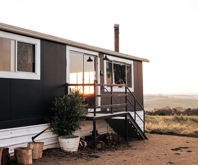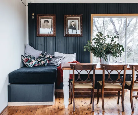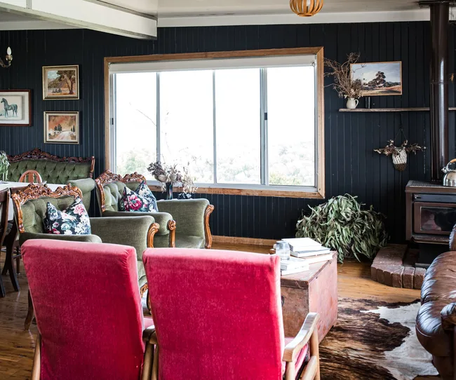 The three-bedroom cottage now has a black exterior that provides a stark contrast with the surrounding bushland on the 400-hectare property that Elise owns with husband Craig. Large glass windows and doors take advantage of the expansive views and create a connection to the land. Elise and Craig renovated the cottage themselves, “bringing in the tradies to do plumbing and solar”, and added insulation. Elise, who has renovated and designed a stunning apartment in Sydney’s Woollahra as well as a rundown tailor shop and residence in Crookwell, has placed this beautiful cottage on Airbnb to rent.