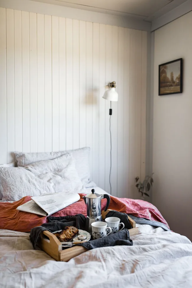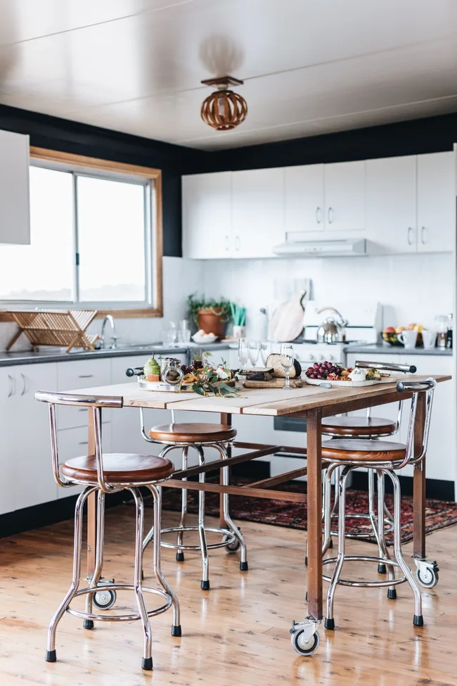 The kitchen was largely left in its original state, in keeping with Elise’s plan to keep the house as sustainable as possible. She wanted to keep anything that worked and gave the right feeling to the house, adding unique and personal touches for texture and interest. With the exception of linen, everything in the house was upcycled throughout the construction of this cottage. This includes the wooden landscape materials and the insulated exterior panelling.