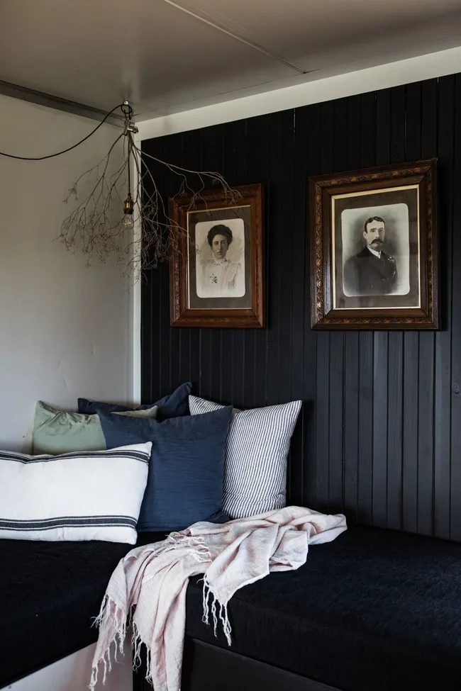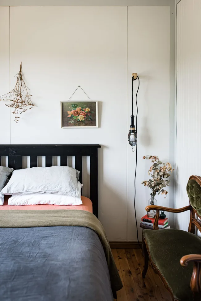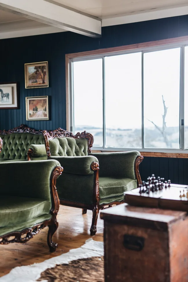 The cottage and its adjoining working sheep and cattle farm has been in the family for generations, and Elise nods to these forebears – her husband’s family – in the interior design. She deliberately harks back, reminding visitors to reflect on the time before. “The cottage sits high on a hill and overlooks the lands generations before us have farmed. The holes dug for fences and the paddocks ploughed,” she says.