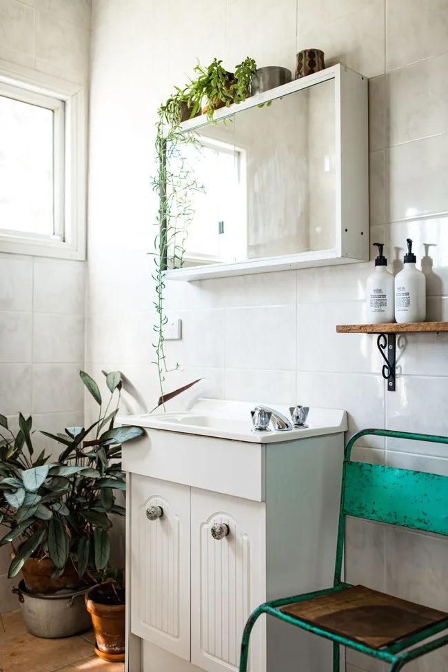 The bathroom was largely left as it was. Elise painted the house white and black to maintain some a cohesive feel, but then brought in colour and nature to add interest and texture, like this second-hand green chair found in an op-shop locally.