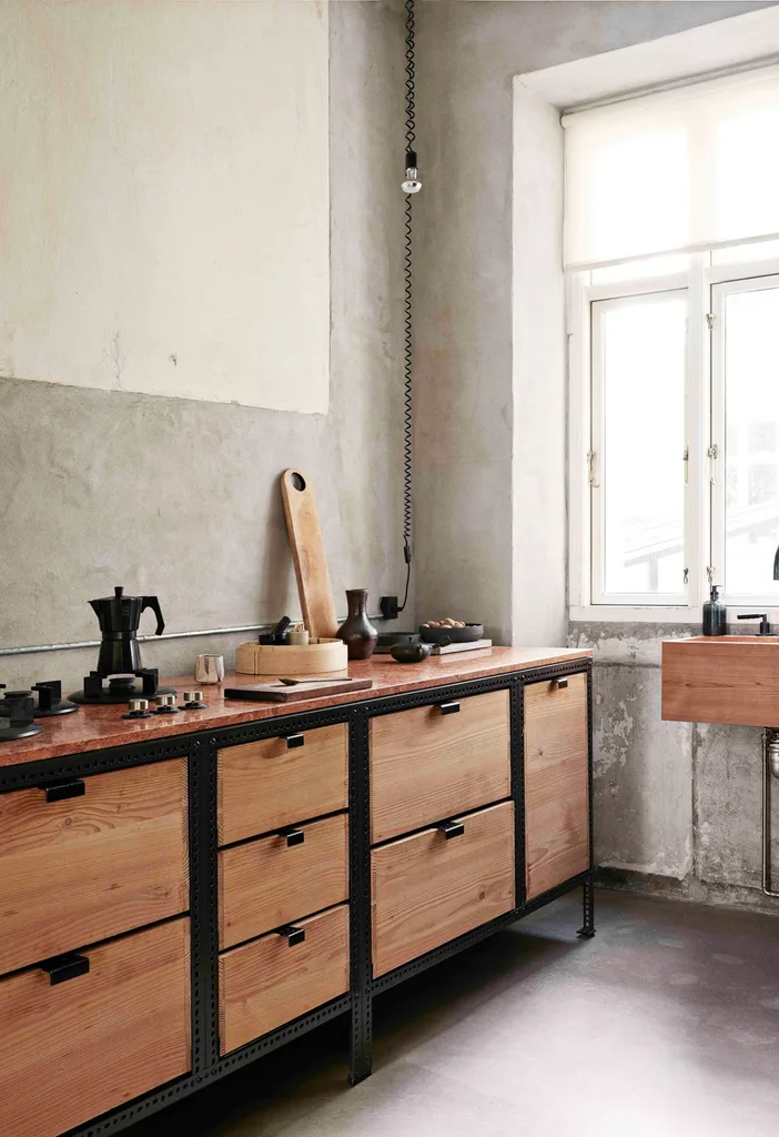 The bespoke kitchen was by FRAMA. It consists of a metal frame with drawers made from Douglas fir and a marble benchtop with a built-in gas burner. High beam On an upright wooden beam, which has the shape of a pedestal, one of Franca’s characteristic vases is placed in its clean and raw, unglazed shape on a pile of books.