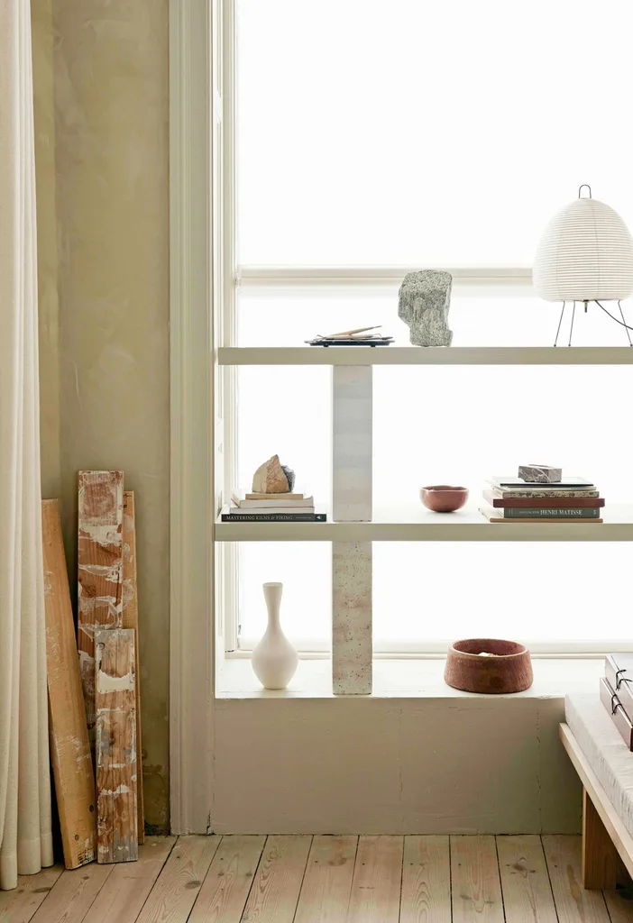 When it comes to the design of a home, Niels is interested in behaviour and emotions. “The way a room is decorated does something to us, and I like the idea that it is our intuitions and emotions that really control us,” he says. “Nothing in our home has been chosen based on what would be a practical or logical solution; instead, it is about learning to be present in the moment and to appreciate what surrounds you.” This approach means that a worn stepladder and a couple of boards stained with clay residue are just as valuable as any of the design pieces in the home.