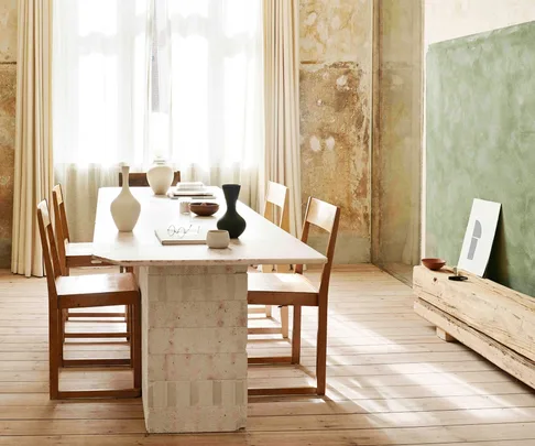 Niels and Franca’s dining room is decorated simply to serve as a place to enjoy meals and entertain guests. Along one wall, a solid pinewood board functions as both a bench and a shelf. The table consists of a massive marble slab placed on top of stacked gypsum blocks and is surrounded by FRAMA ‘Chair 1’ stacking chairs. The ceramics are homeowner Franca’s own.