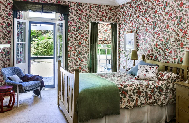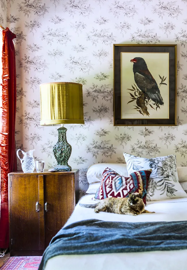 “The bedhead and end were ‘antiqued’ by Mum,” says Charles. The low-back Seymour chair creates a dynamic contrast to the 1950s wallpaper, linen and curtains. On the bedside table is Charles’ Atomic white onyx vase, a prototype.