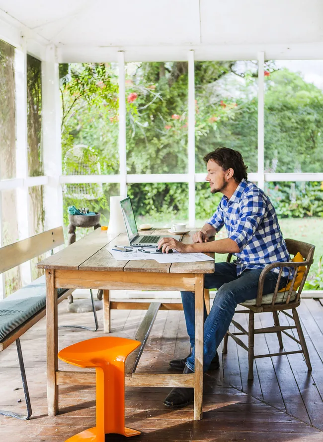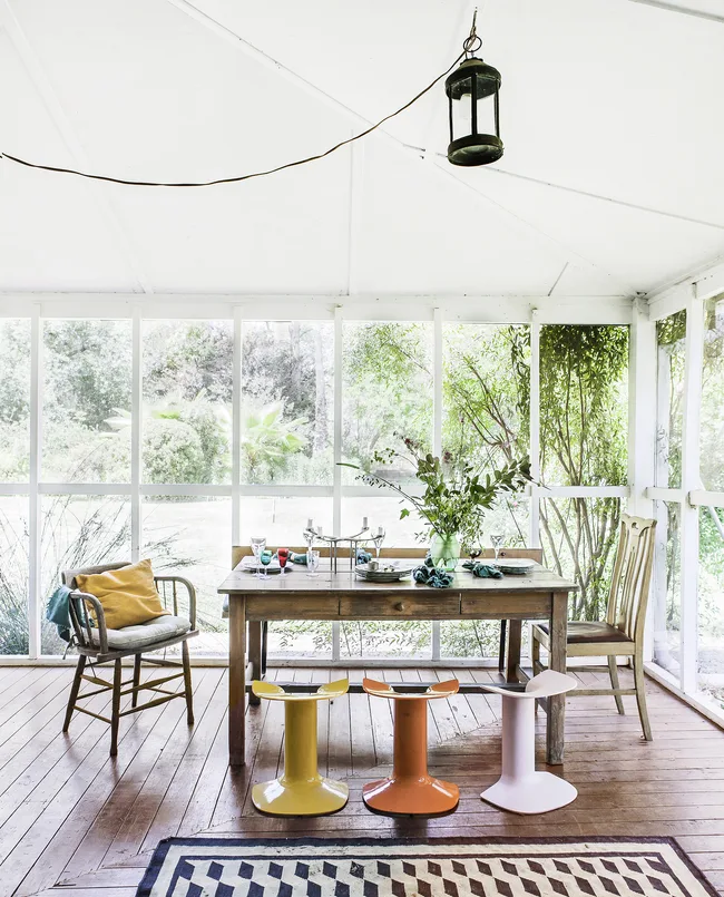 On the table in the Garden Room is a prototype of the candelabra Charles designed for Danish design company Menu. The Serif stools, available from Top3 By Design, are also his design.