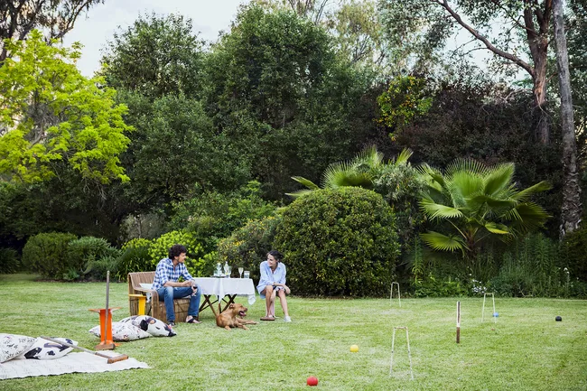 Charles and his sister, Virginia, with Bundy, their American Staffordshire terrier. Croquet is a popular pastime on country properties.