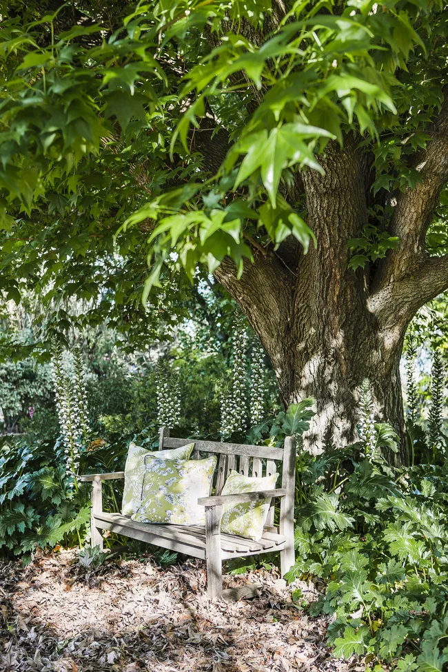 A bench beneath the majestic liquidambar tree in the front yard is a cool retreat, acanthus plants adding to the forest feel.