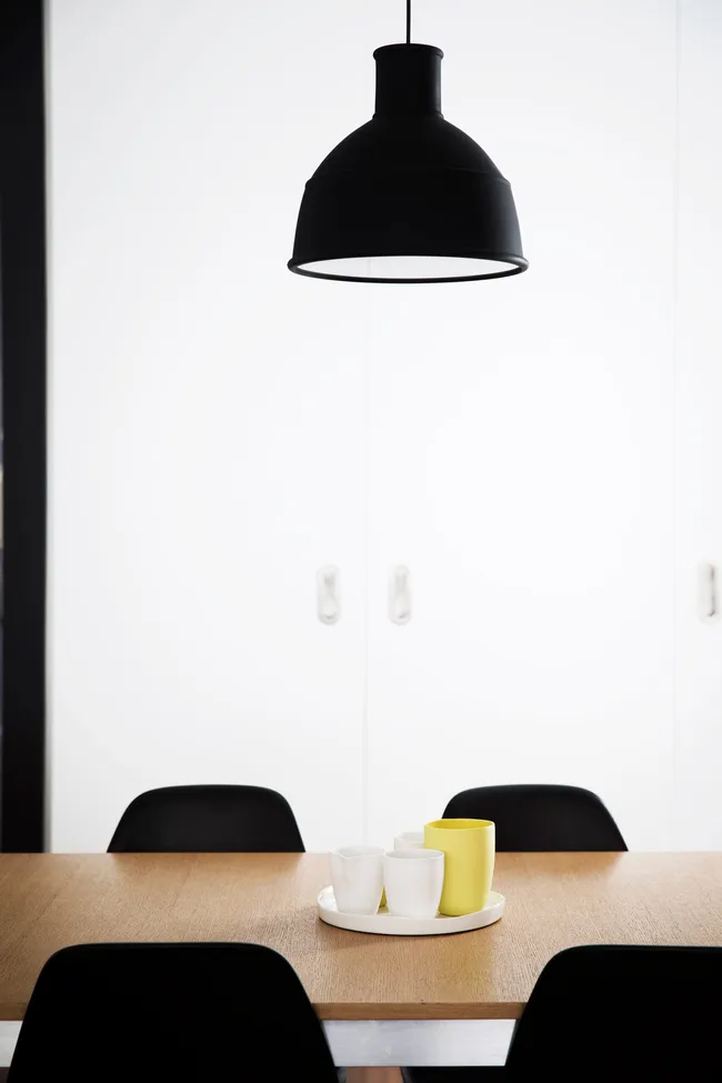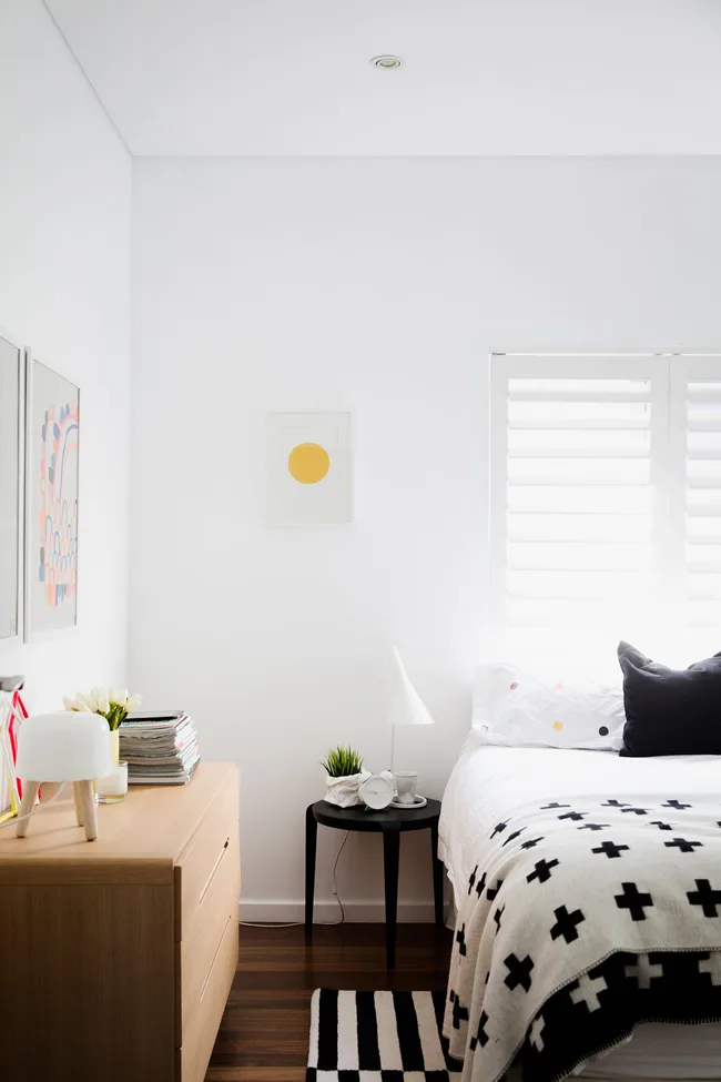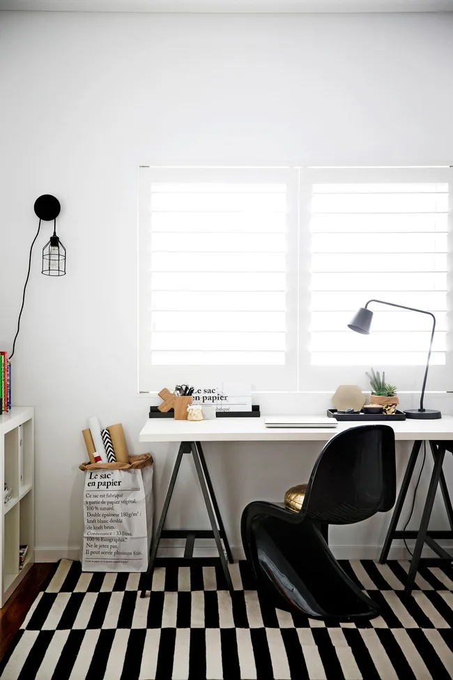 A Pia Wallén blanket, Sheridan bedlinen and Ikea rug continue the no-fuss, black and white theme in the master bedroom.