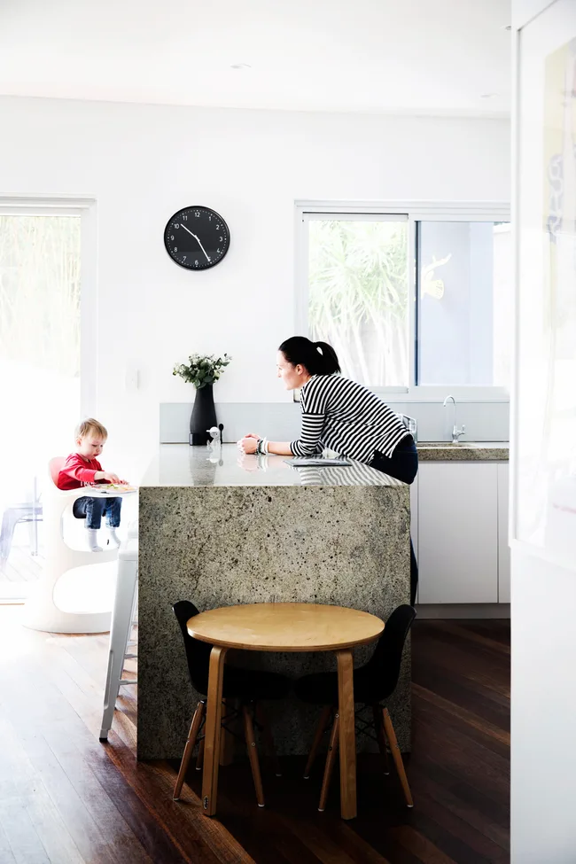 The family mainly hang out in the open-plan lounge/kitchen/dining room. When people come over they hover around the large island bench.