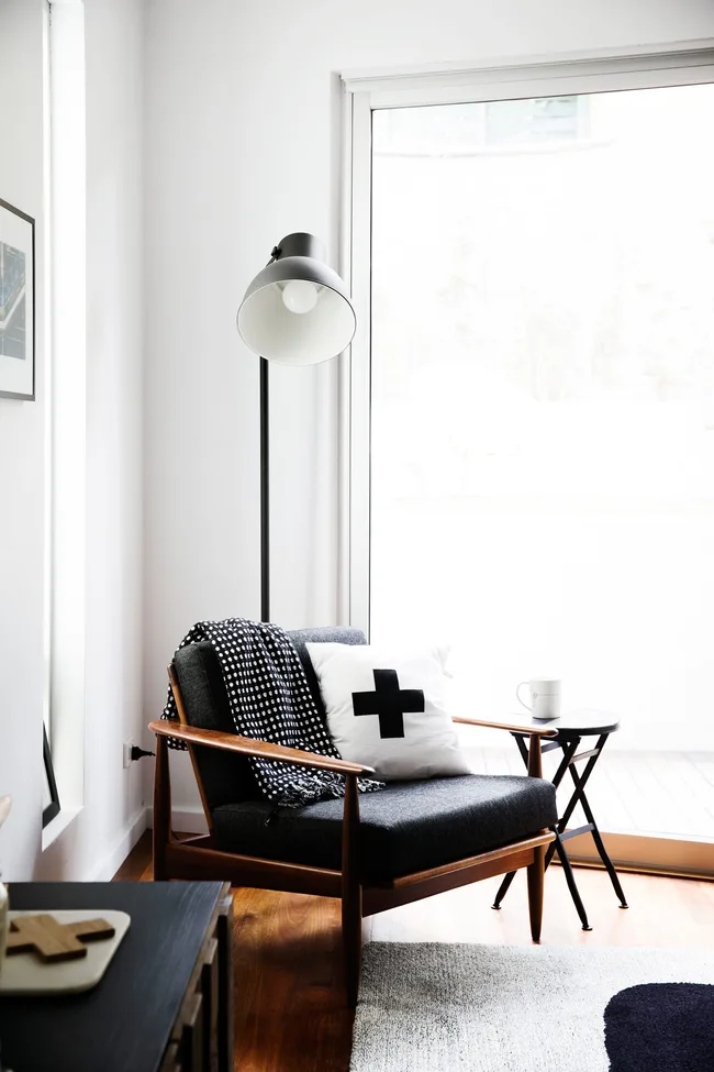 An original ’50s Parker chair was a gift from Clare’s dad. It’s the perfect reading spot with a dark powdercoated floor lamp above.