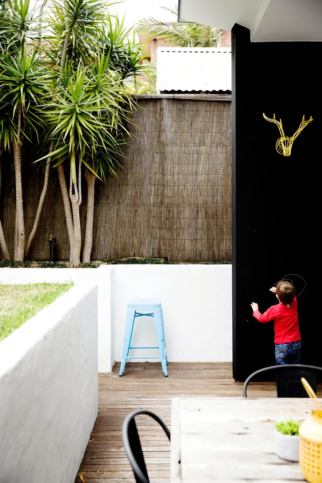 One of the exterior walls has been painted with blackboard paint for the boys. The yellow deer head is from Terrace.