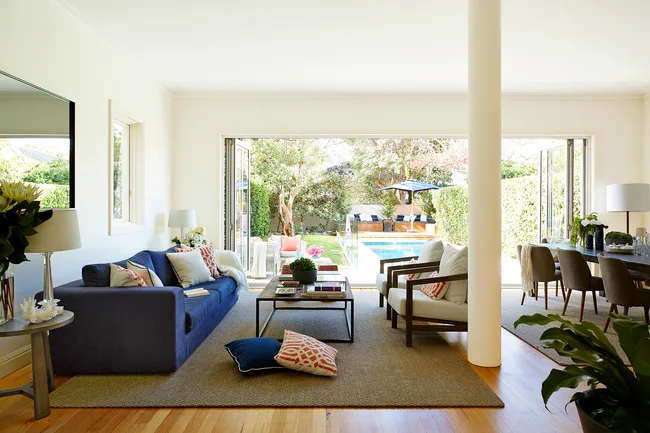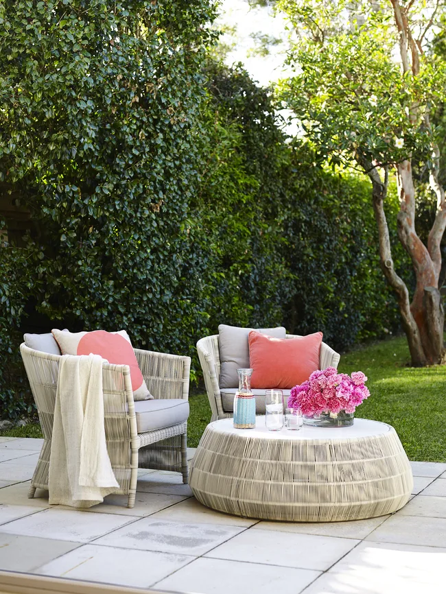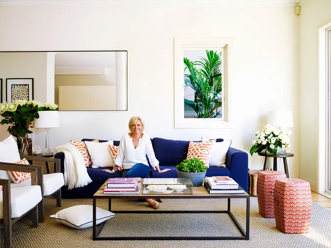 The bifold doors are often drawn right back, creating a free-flowing indoor/outdoor room that’s fun for the family and a dream when entertaining. “I love the openness and indoor-outdoor layout of the house,” says Shelley. Sofa from Papillion Furniture. Orange cushions in Schumacher Imperial Trellis. Armchairs from MCM House. Table lamps from Sue Riley Home Collections. Sisal rugs from International Floorcoverings.