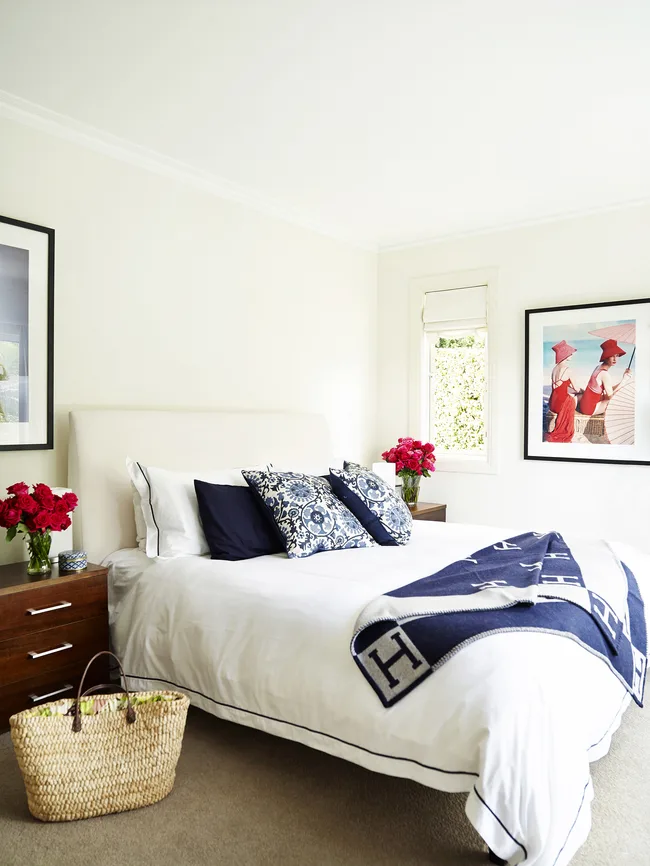 In the main bedroom, navy-trimmed bedding and a predominantly orange artwork tie in with the colour scheme downstairs.