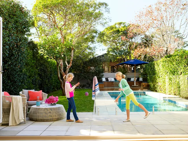 Emily, seven, and Lucy, nine, play on the terrace. “The girls are always in the backyard or in the pool, especially in summer,” says Shelley. Made in the Shade market umbrella from Cotswold Furniture Collection.