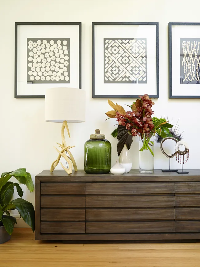 In the foyer a trio of tribal-style prints by Designer Boys Collections, available from Boyd Blue, complements a grouping of treasured travel finds.