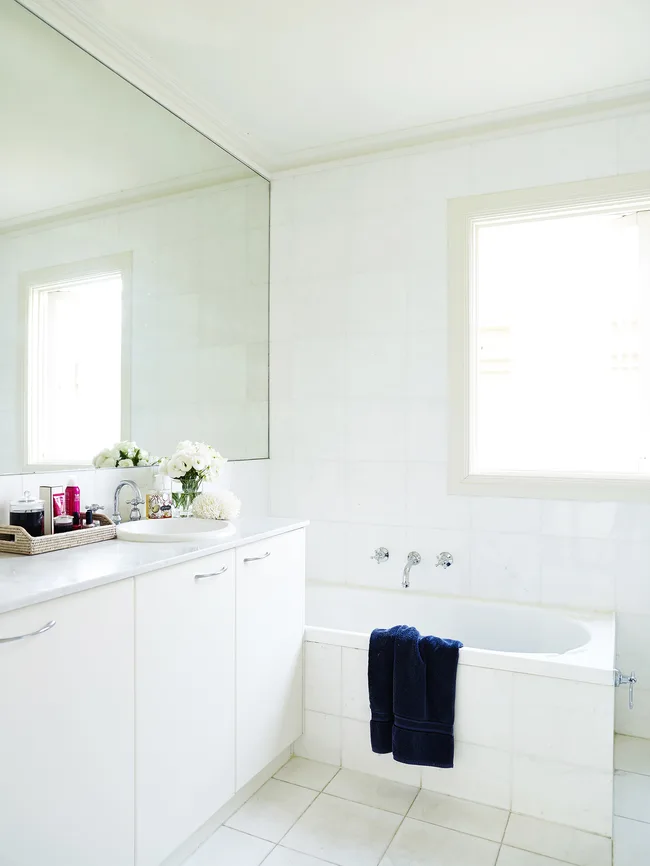 All-white fittings and a generous mirror bounce light around the recently renovated ensuite.