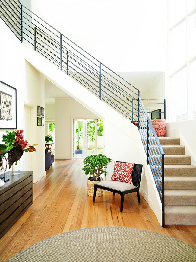 The front door opens into a generous foyer with a cathedral ceiling. Occasional chair from MCM House.