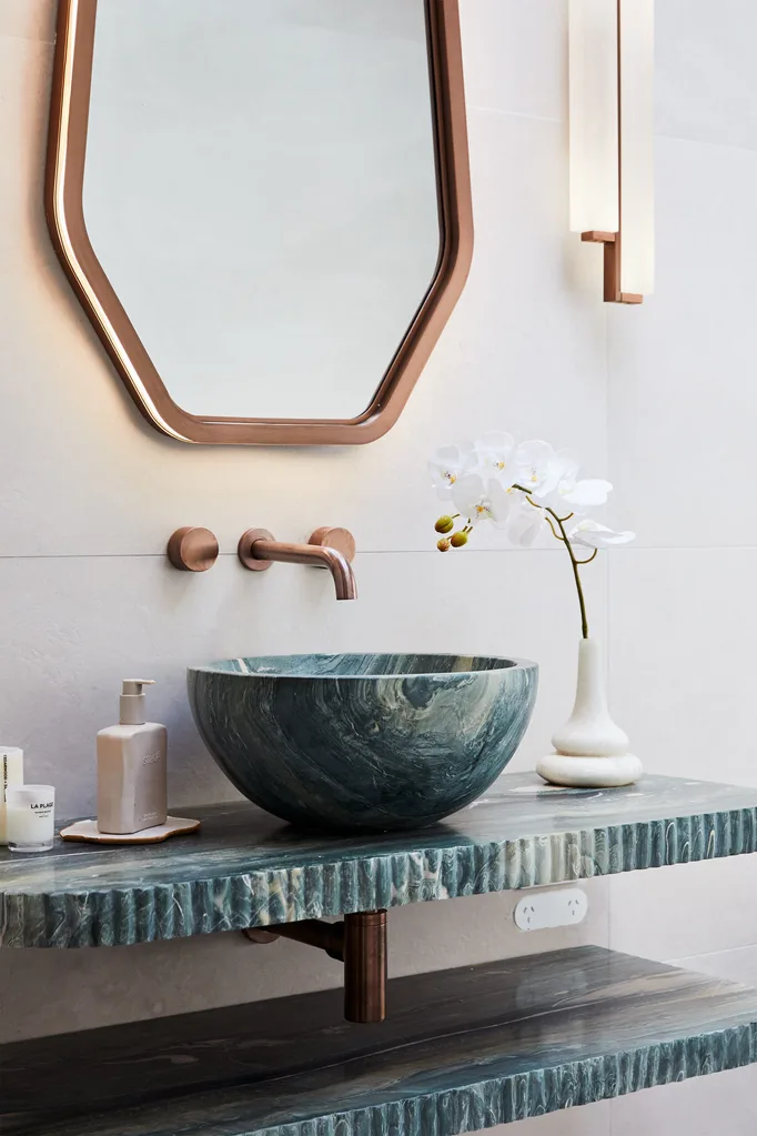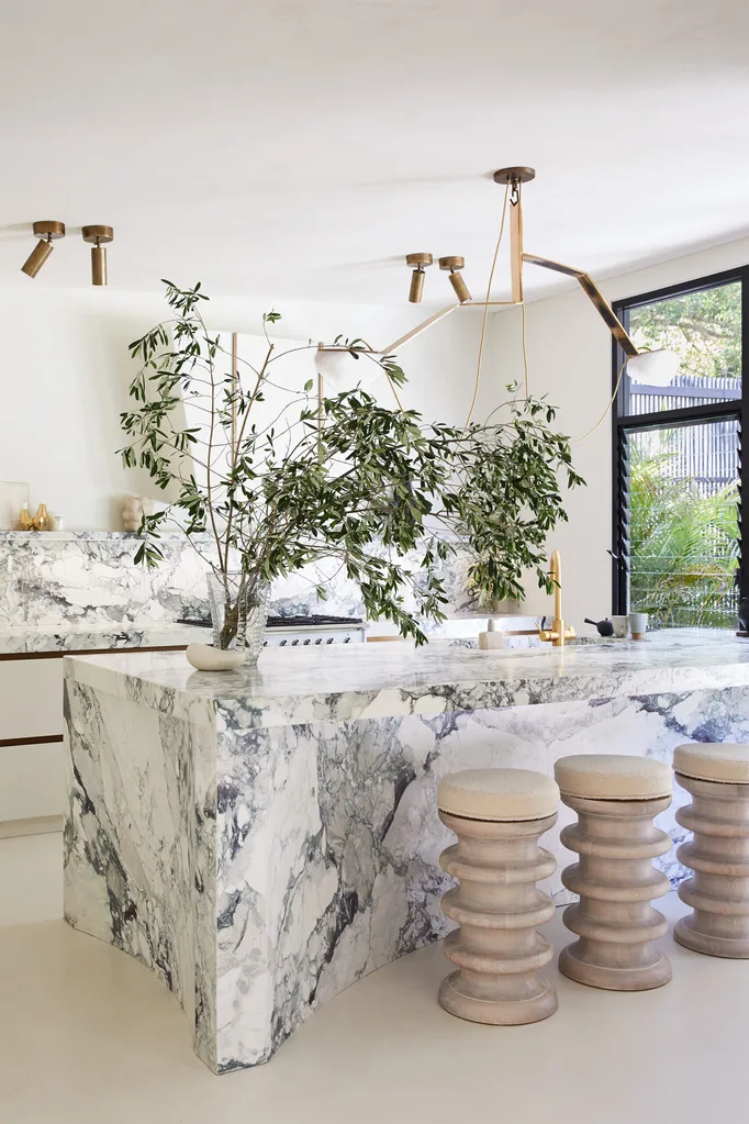 (Photo: Supplied)The new kitchen now boasts a breathtaking Brescia marble island bench and splashback, that swirls with a mixture of green and deep navy blue veining. A clever concave feature helps it not feel like a “heavy, monolithic block,” explains Nina.