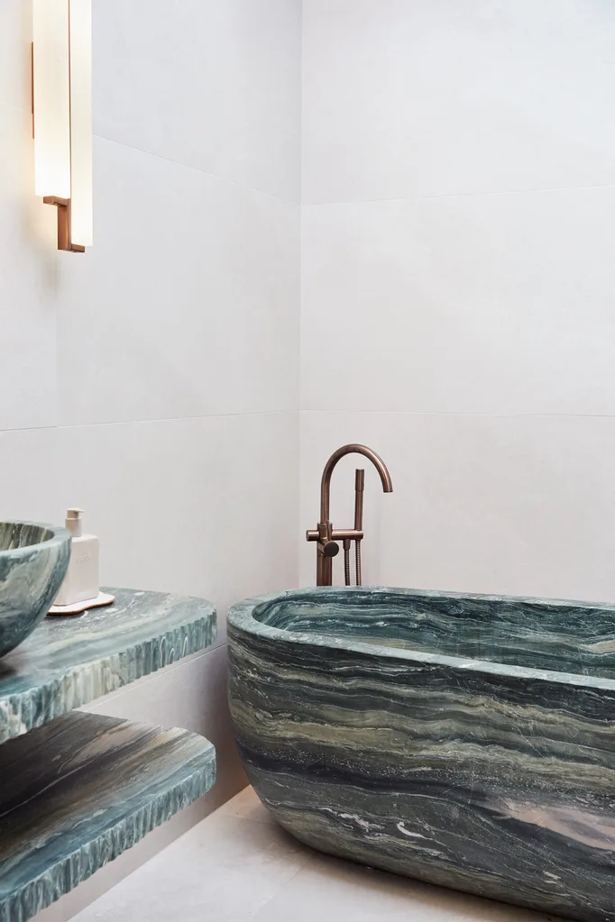 But the most impressive marble can be found in the bathroom, where a bathtub carved from solid stone and matching vanity make a true statement. In fact, the floor underneath needed to be reinforced in order to handle the sheer weight of the 900kg tub.