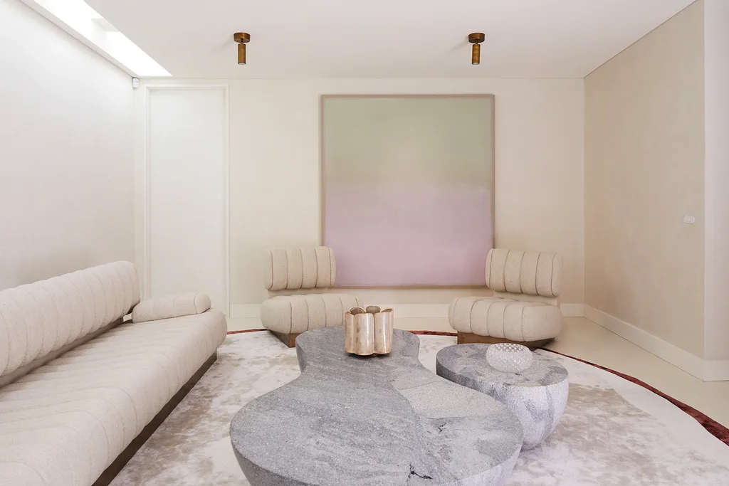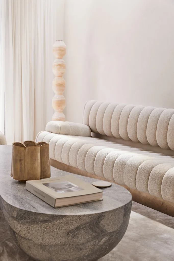 Nina designed the epic stone coffee table herself, which required craning into the space.