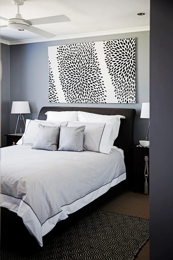 The master bedroom is an excellent example of this contemporary style, with its masculine brown-leather bedhead, dark-wooden bedside tables and simple grey and white bedlinen.