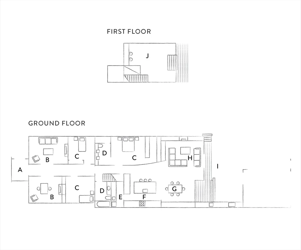 FLOOR PLANS: A. entrance B. showroom C. bed D. bath E. laundry F. kitchen G. dining H. family I. deck J. study/living