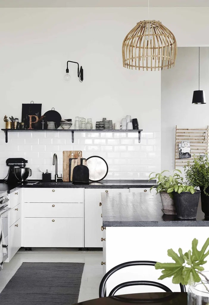Kitchen The family chose unfussy white cabinets, black benchtops and subway tiles.
