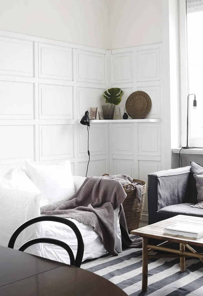 Detail The coffered feature wall adds depth and visual interest to the all-white palette.