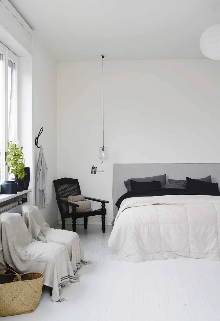 Main bedroom Annemo made the bedhead in this elegantly sparse room. The linen is from H&M Home and the black rattan chair was a secondhand find. Glass pendant light, from a discontinued range at Tine K Home; many of the brand’s latest designs are in rattan, raffia or palm leaf.