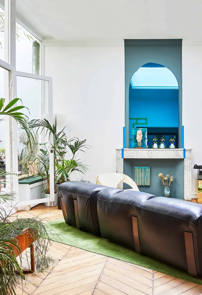 Living room Jean-Christophe customised the blue mirror above the fireplace. Small sculpture on mantel by Olivier Millagou. Brass table and standing lamp, both found at flea markets.