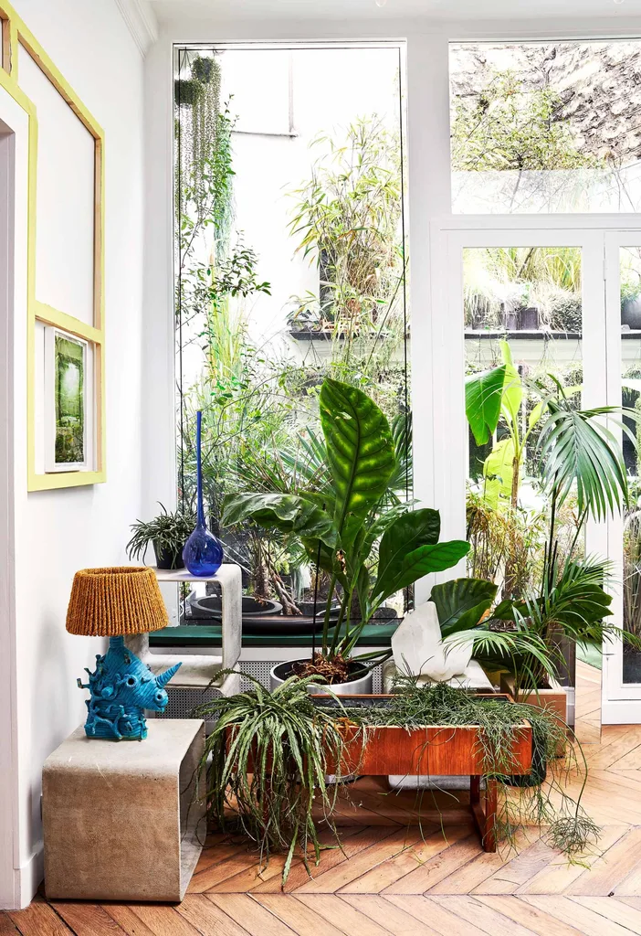 The “deliberately chaotic” plant-filled terrace is a virtual urban jungle of lush greenery, providing a meditative view from the living room and renovated kitchen.