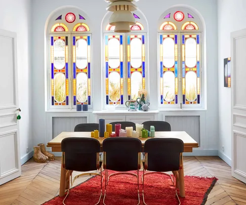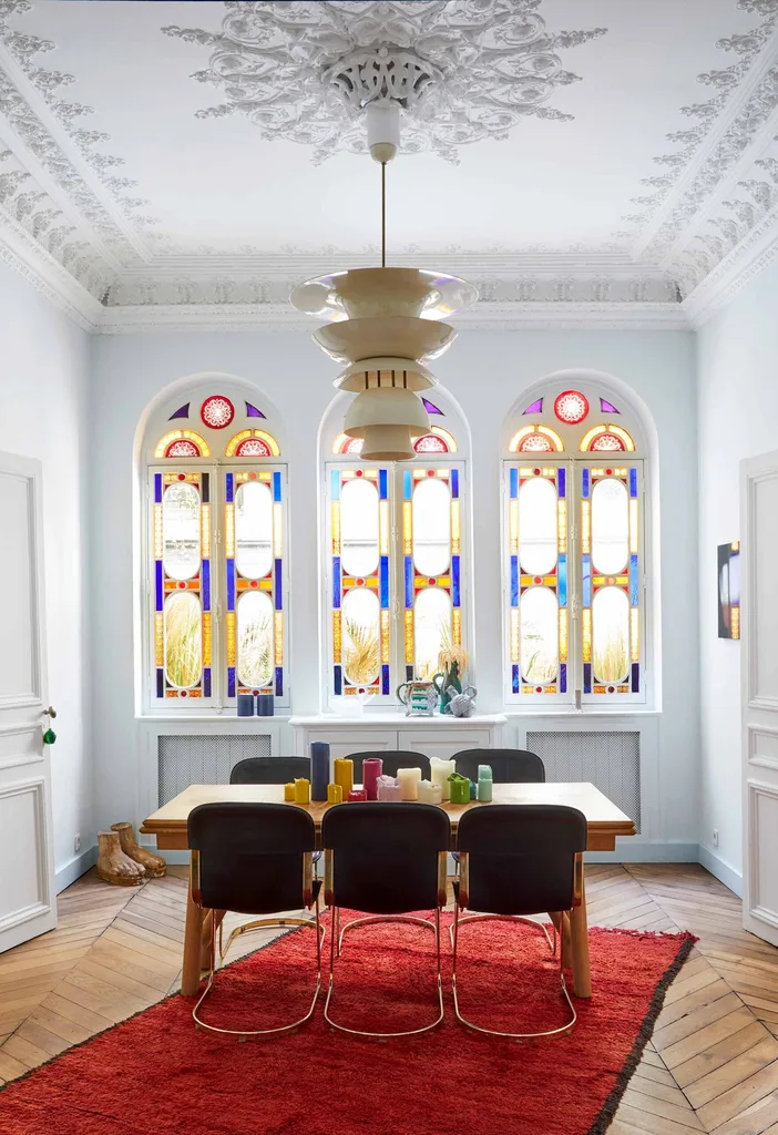 Dining room The elaborate stained-glass windows tower over the simple timber table and 1970s leather and brass chairs. Jean-Christophe bought the light from a flea market; the vintage plaster feet appealed to his sense of humour. Red rug, Bleu De Fes.