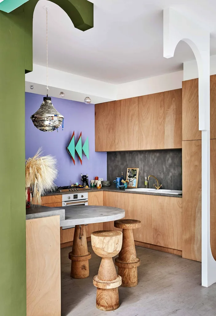 Kitchen This open space is right near the entrance to the apartment, so Jean-Christophe added arches to create a visual separation. The cabinets are made from upcycled timber boards, the floating table is cast from concrete, and the stools are African in origin.