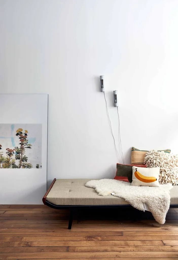 Guest room The day bed hails from Belgium. Ceramic lights, bought in the south of France. Artwork by Jean-Christophe.